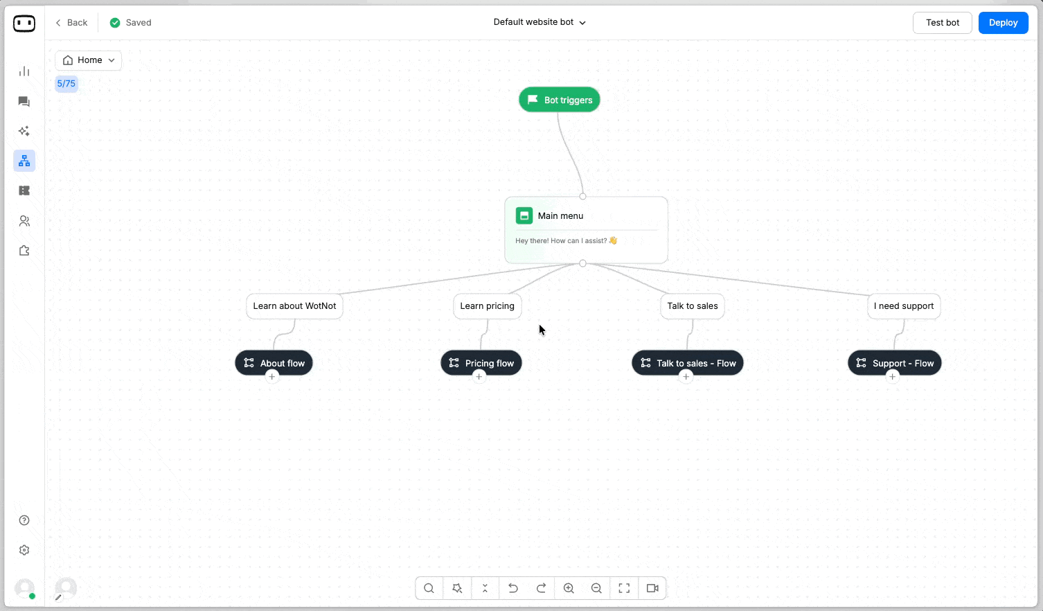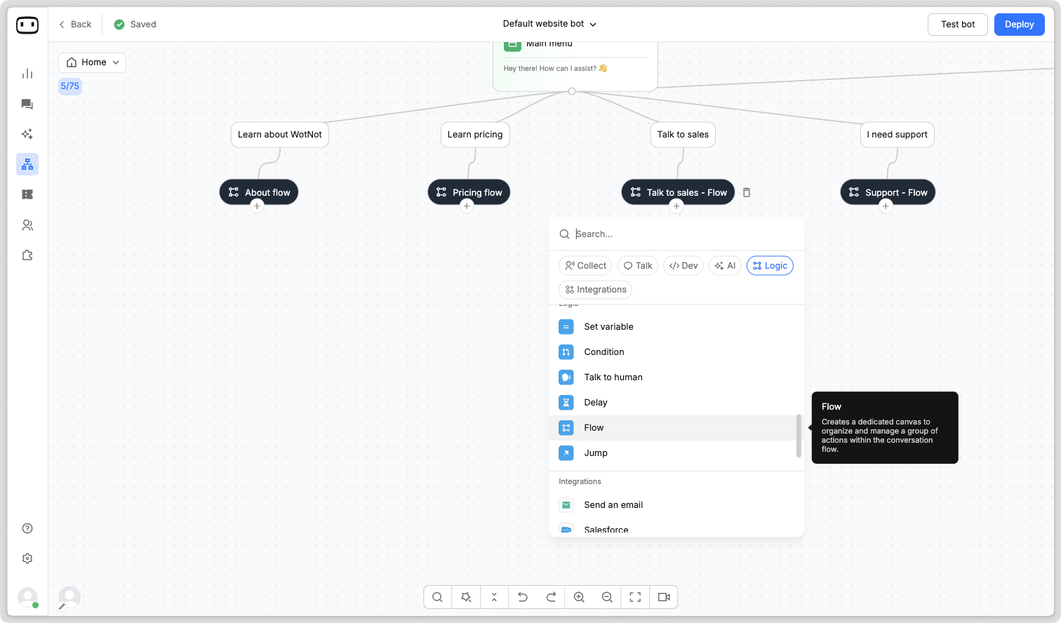 For example, if you have three items in your menu like Explore WotNot / Talk to sales / Support, instead of building all the flows in one tree, you will build three flow with the same names. So that each flow has only its flow in it.