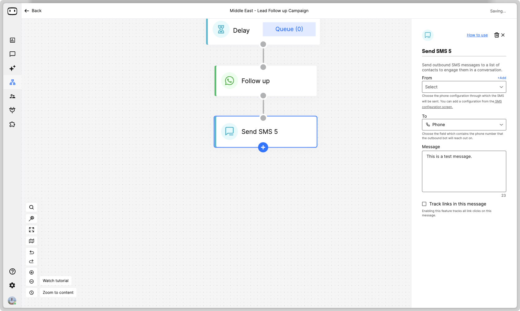 1. Add the 'Send SMS' action block on the canvas&#x20;