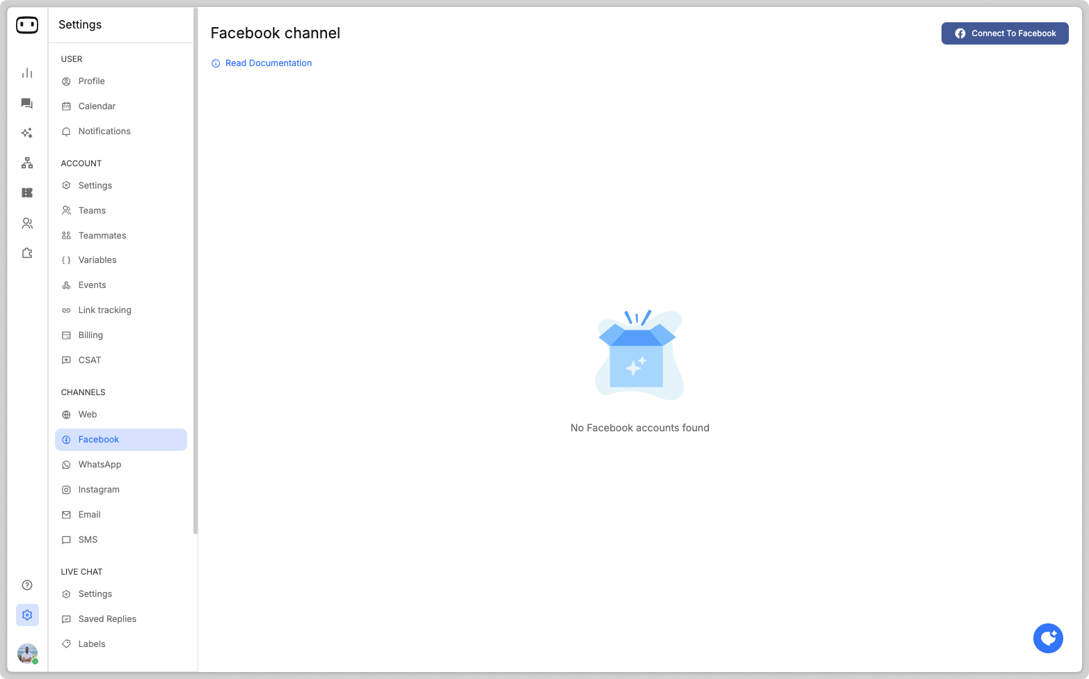 Goto Settings > Channels > Facebook Messenger and click “Connect to Facebook”.