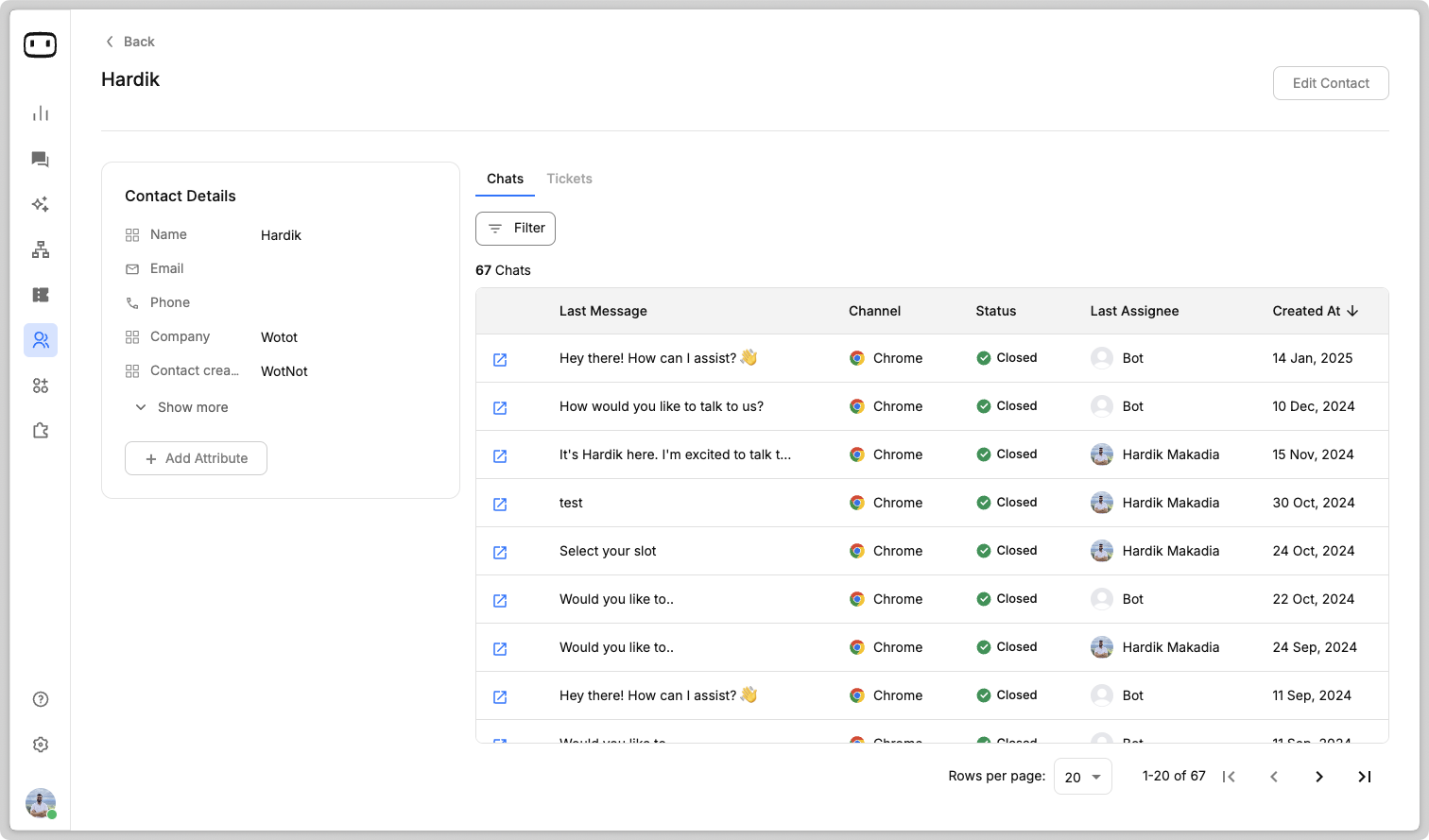 You can click on any contact from the contacts page to view the contact details. This will show you all the field values associated with that contact and the conversations that the contact had with your chatbots in the past.