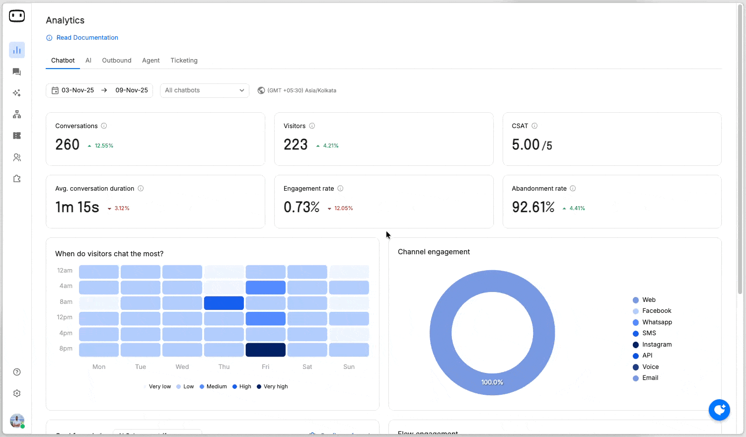 This visual representation helps you identify the peak times and days when users are most likely to interact with your chatbot. This information can be valuable for optimizing support schedules and chatbot availability.