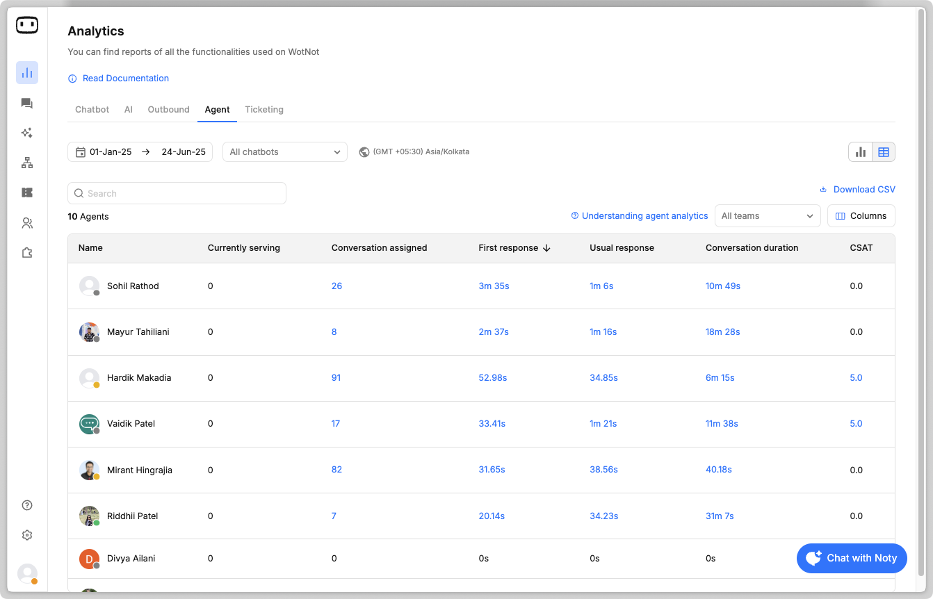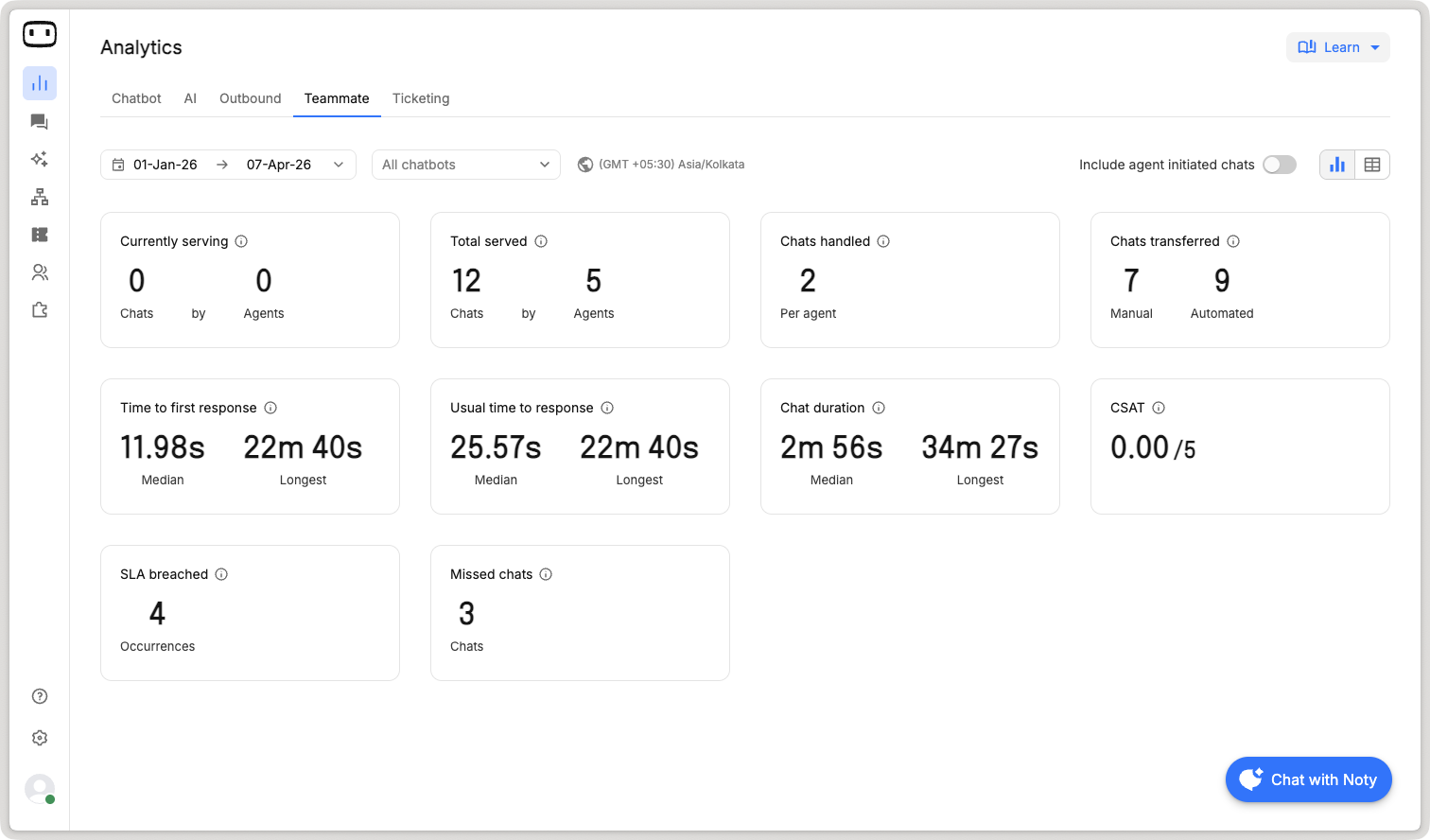 View KPIs related to your teammates performance when using the live chat feature to manually speak with your customers and users.